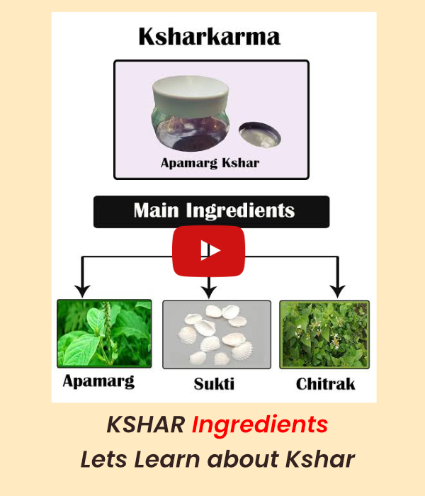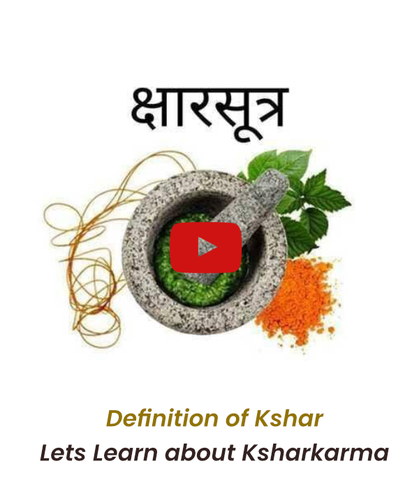 Kshar It is used in the "Kshara Karma" procedure to treat conditions like hemorrhoids, fissures, and fistulas, as it has properties that can cut, incise, and scrape tissue. It is also applied externally as a medicinal paste or dressing (Ksharapichu) or used in a medicated thread (Kshara Sutra) for a less invasive surgical approach. Uses of Kshara External application: Applied directly to the affected area to treat ano-rectal disorders such as hemorrhoids and fistulas. Used in the form of a medicated thread (Kshara Sutra) to treat conditions like fistula-in-ano by cutting through the tissue over time. Used as a medicated dressing or gauze (Ksharapichu) to clean and debride non-healing ulcers. Internal consumption:Used in formulations like tablets (Kshara Gutika), pastes, and medicated oils. Traditionally used for conditions like ascites and internal growths (gulma). Other applications: Used to remove undesirable growths like warts, adenoids, and tonsillitis. Its ability to cut and remove tissue makes it useful in places where sharp surgical instruments are difficult to use. How it is preparedThe dried parts of medicinal plants that exude a milky sap are burnt into ash. The ash is then dissolved in water and filtered. The mixture is boiled until all the water has evaporated, leaving a fine, alkaline powder. This powder is stored in an airtight container. Key considerations Alkaline nature: Kshara is highly alkaline, with a pH similar to a baking soda solution. Potential risks: It is considered a potent medicine, and incorrect preparation or application can be very dangerous. Contraindications: Its use is contraindicated in certain conditions like bleeding disorders, eye diseases, and in debilitated individuals or during pregnancy. "